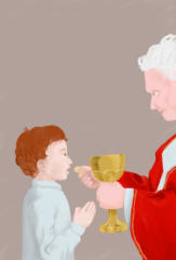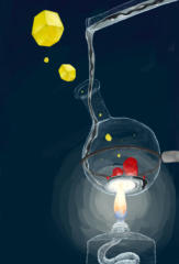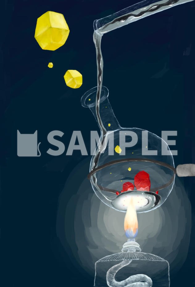 「賢者の石」というお題で描いた油彩風イラスト。西洋の錬金術師たちが、賢者の石を作るために用いていたのが硫黄と水銀だったということ、また東洋では「辰砂」と呼ばれる硫化水銀を実際に薬として用いていたことから、硫化水銀を合成する様子を描きました。