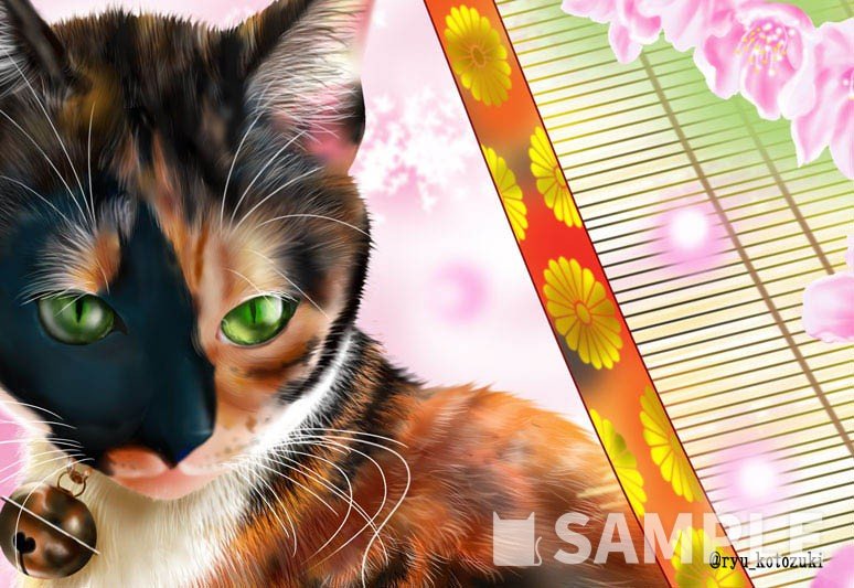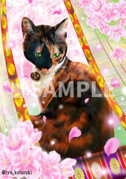 平安時代の姫様っぽいイメージで描きました。猫さんの柄に苦労しました。